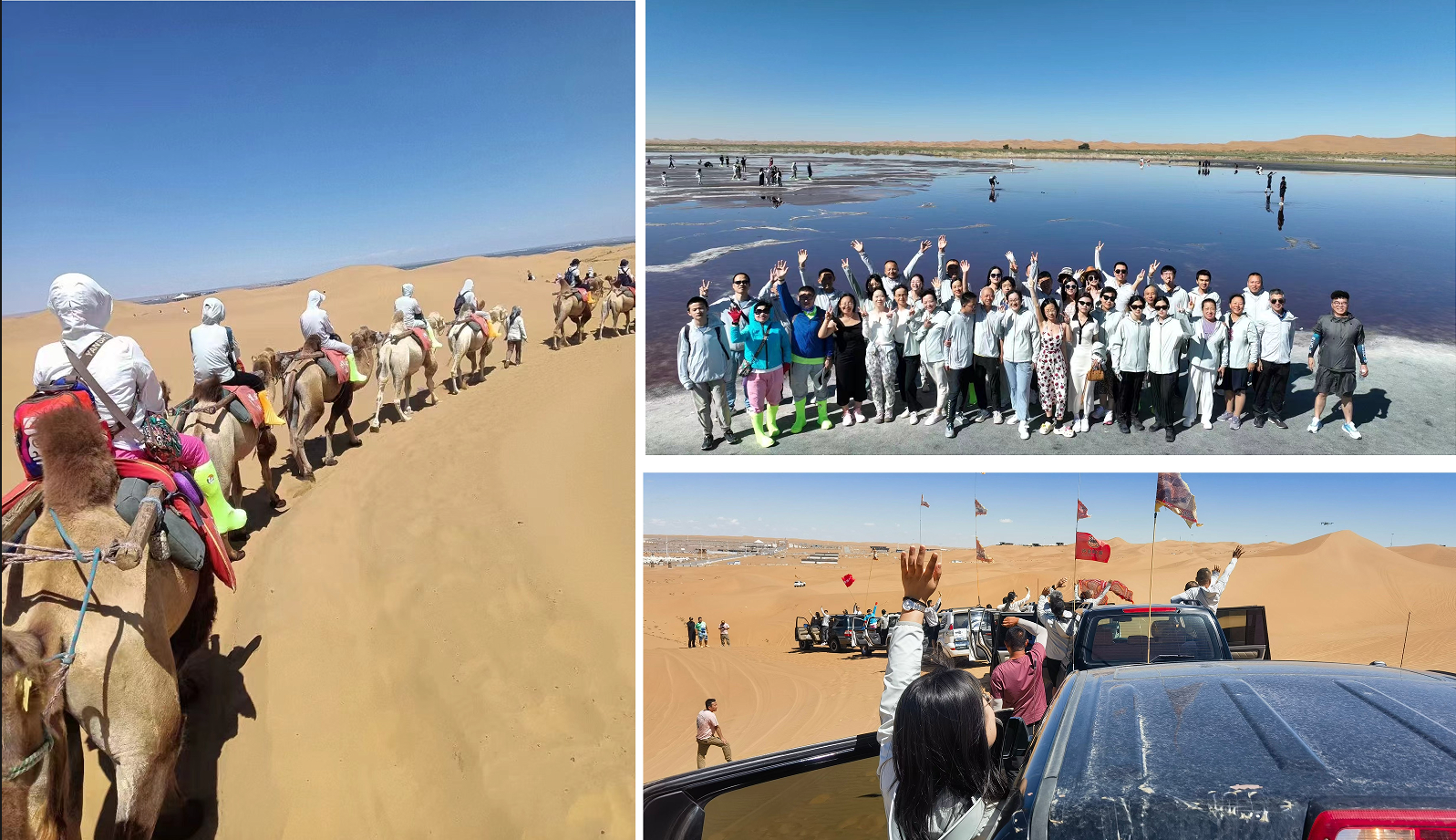 第三站,也是此次旅行的高潮--阿拉善五湖穿越。乘越野車翻越一個個沙丘,前往阿拉善沙漠腹地,車內尖叫聲不斷,感受真實的速度與激情。駱駝湖、蛋黃湖、吉他湖、天鵝湖、烏蘭湖各具特色,最美當屬有“地球之心”之稱的烏蘭湖,只一眼,就被那魔幻熾烈的紅色所震撼,從空中俯瞰,血紅色的湖泊被一道道彎曲的白色結晶隔開,就像一顆血脈噴張的心臟,鑲嵌在毫無生機的金黃沙漠中,透出令人無法言喻的妖嬈和魅惑,不禁讓人感嘆大自然的鬼斧神工。
