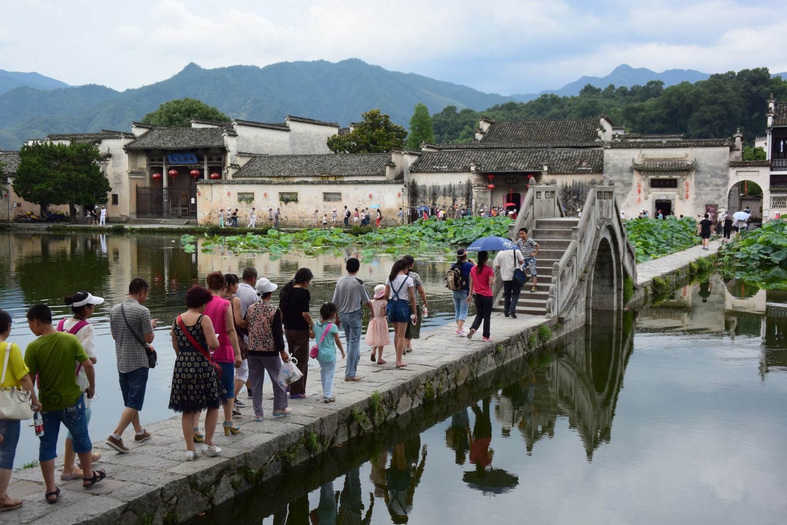 7月18日我們早早集結,從西安出發赴黃山景區。一路上大家談笑風生,全然不覺乘車的辛苦。19日我們順利抵達第一站古徽州,導游細細地講述了徽州的人文歷史、山川風物,接著參觀了代表徽派建筑的歷史文化遺產-宏村。一幢幢古色古香的徽派建筑古民居在陽光的映照下,顯得美麗而古老,渾身透出一種濃厚的歷史感。名居里,古色的木桌、雕花的窗口、滴水的天井,拐彎的小弄,似乎全都可以還原成陳舊的故事來,讓人回味。這些民居集磚雕、木雕、石雕、彩繪為一體,簡直是工藝美術的精品。村里巷道邊那清清的水流潺潺流淌,七彎八拐,最終把封閉的家家戶戶緊緊地聯系在一起,讓人不禁驚嘆。湖心堤壩上如畫的拱橋與湖上風動的荷香,岸上輕擺的綠柳,相映成趣,妙不可言。荷塘的外圍好似一張彎弓,四周青石鋪展,粉墻青瓦整齊有序,真真好似一幅美麗的中國畫,使人感到恬靜祥和,美麗動人……完全構成了一幅完美的畫卷,展示著它那悠久的歷史和廣博深邃的文化藝術底蘊,真不愧為“中國最美畫里鄉村”。