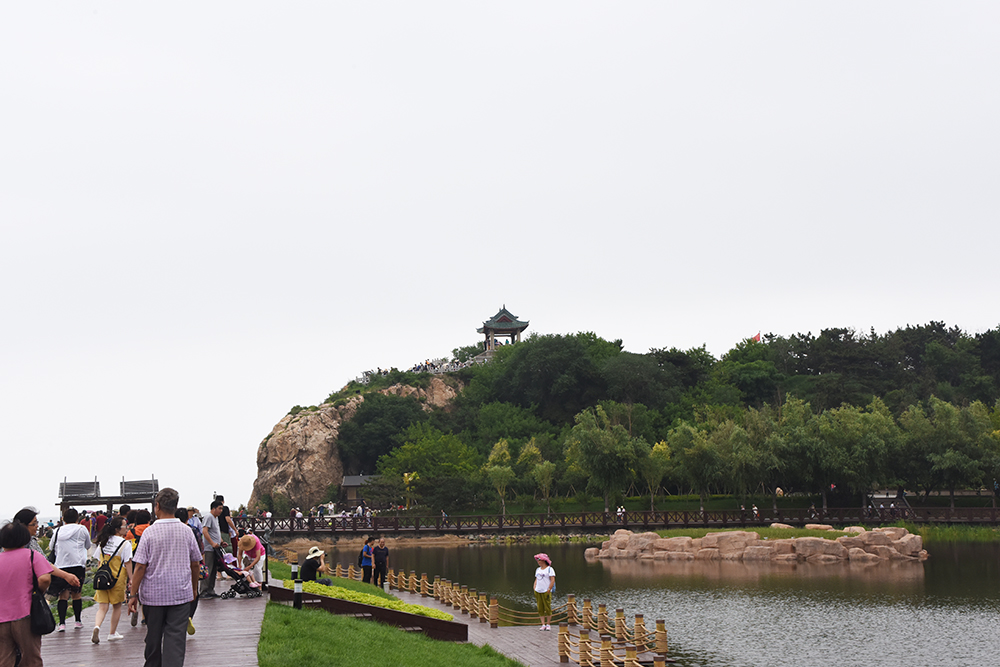 第四天 在秦皇島,品味鴿子窩的閑散靜謐 鴿子窩公園是北戴河的標志性景點,到北戴河必去的地方就是鴿子窩。我們剛到的時候這里正在閉園裝修,特別失望,以為到返回之前都不能進去參觀了,沒想到老天還是很眷顧我們的,在我們離開的前一天竟重新售票了! 一大早吃完早飯,我們便隨著人潮一起進入了公園,穿過一片青草地,躍然于眼前的是一片巨大的、開闊的沙灘海域——大潮坪。一行人迫不及待的拎著鞋光著腳沖了進去,淺淺的海水溫婉的拂過腳面,細細看去,竟然能看到許多小魚在四周游樂!海浪規律的卷起又落下,帶來無數蛤蜊、小蝦、小蟹,這是大海的饋贈,是生命的力量。